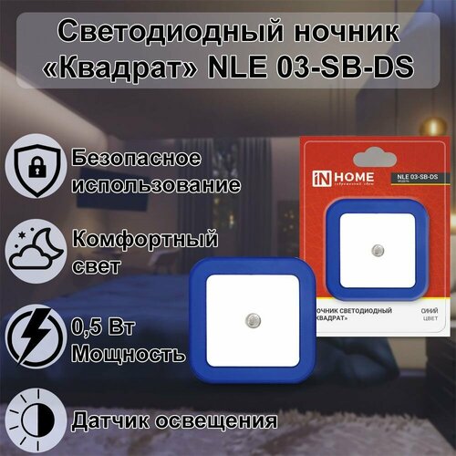Ночник светодиодный NLE 03-SB-DS квадрат синий с датчиком освещения 230В 6000К IN HOME (2шт) (арт. 4690612028798)