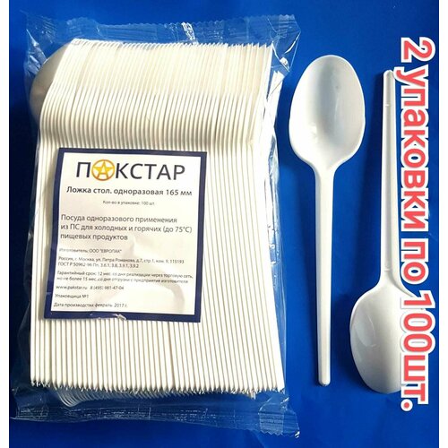 Ложки столовые PakStar белые 200 штук / Ложки одноразовые белые, 2 упаковки по 100 штук