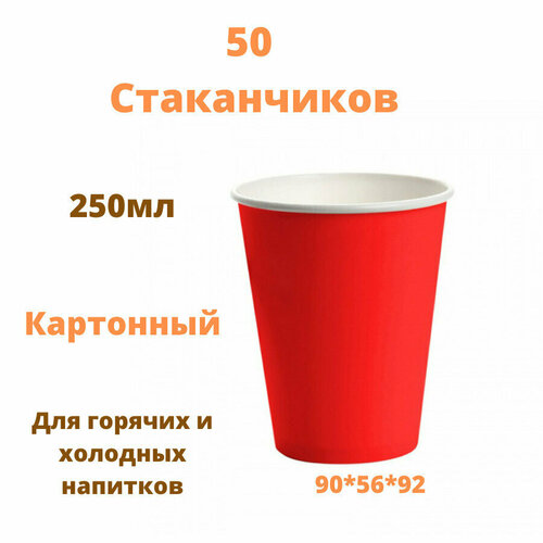 Стакан 50 штук красный для чая и кофе 250 мл/ Стаканчик картонный D80xD56xH92