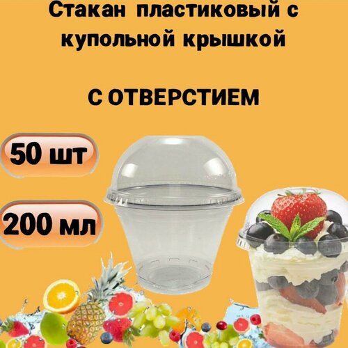 Стаканы одноразовые пластиковые затемнённые с купольной крышкой с отверстием, 200мл 50шт, для коктейлей, десертов, смузи