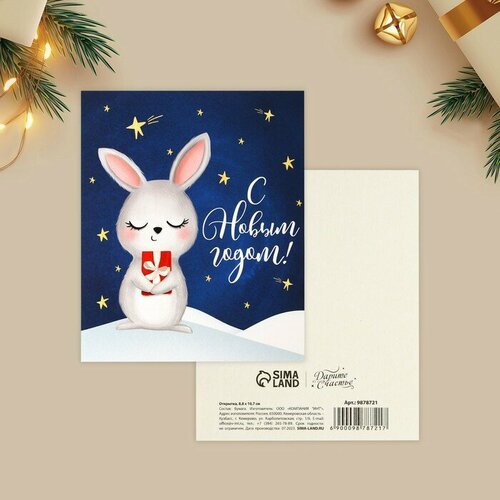 Открытка-мини «С Новым годом!», заяц с подарком 10.7 × 8.8 см