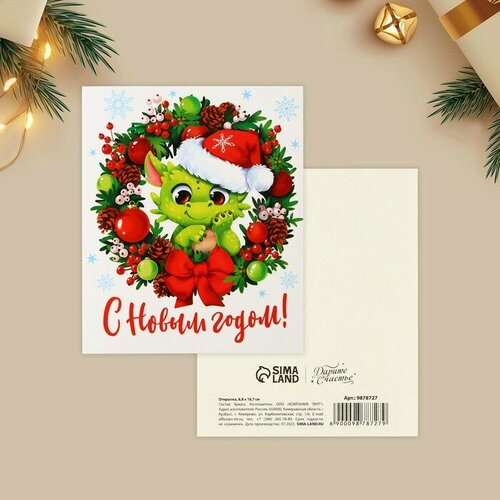 Открытка-мини «С Новым годом!», дракон в венке 10.7 × 8.8 см