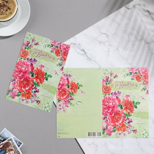 Открытка "Поздравляем!" глиттер, конгрев, цветы, зеленый фон, 19х29 см 9645081