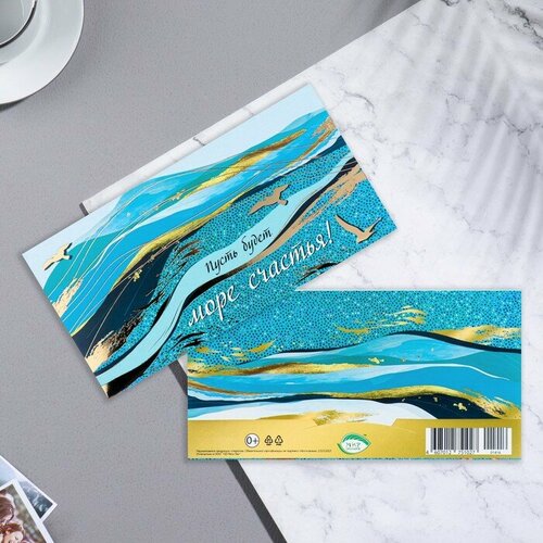 Конверт для денег "Пусть будет море счастья!" тиснение, птицы, бирюзовый фон, 16,5х8,5 см