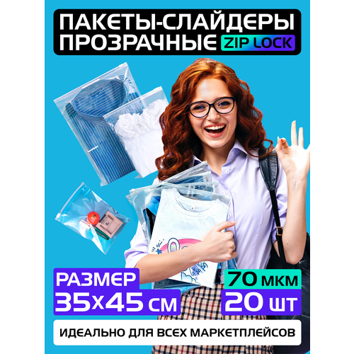 Пакеты слайдеры прозрачные с Zip lock бегунком 35х45 см для хранения вещей и продуктов, 70 мкм. Комплект 20 штук