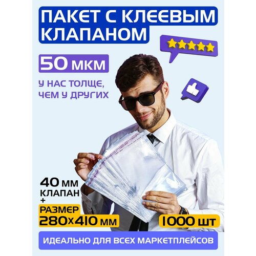 Пакеты упаковочные с клеевым клапаном 280х410 +40 мм, 50 мкм. Комплект 1000 штук
