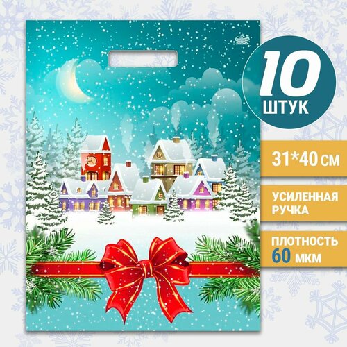 Пакет подарочный новогодний полиэтиленовые "Шарики и фонарики" с вырубной ручкой набор из 10 шт. 31х40см, 60мкм
