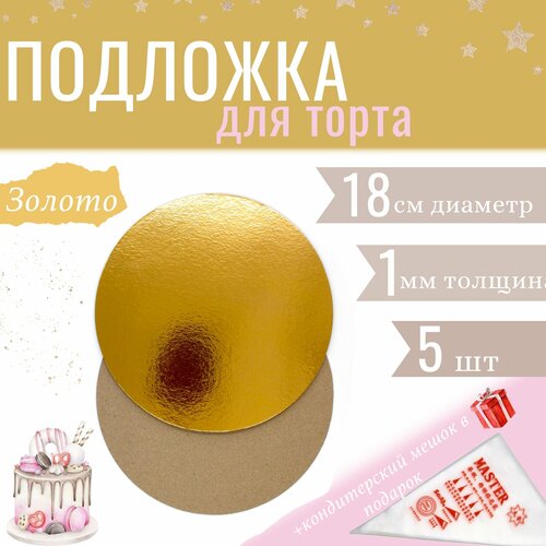 Подложка d18 см, h1 мм, 5шт, золото/крафт, для торта, пирожных, десертов / кондитерские круглые 18 см