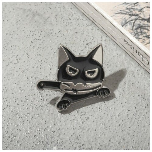 Значок "Кот" охотник, с ухмылкой, цвет чёрный в серебре