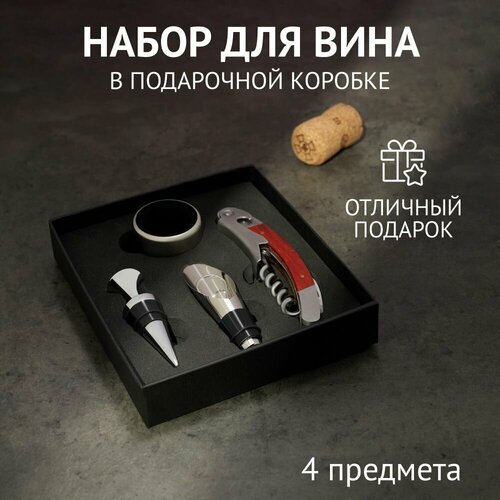 Набор для вина: штопор, конусная пробка, мини-аэратор, кольцо для сбора капель, 16х14х3 см, нержавеющая сталь