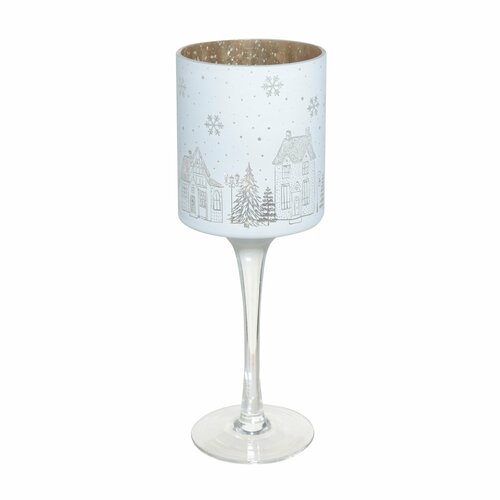 (W)Подсвечник, 25 см, на ножке, стекло, бело-золотистый, Домики, Frosty sparks
