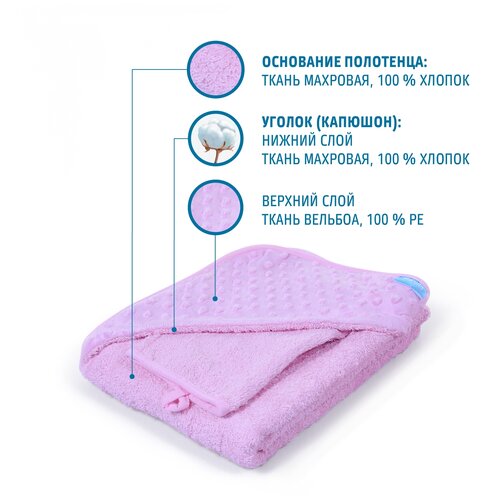хлопокПолотенце с уголком и варежкой Nuovita GRAZIA 100x100 см махра/вельбоа. Основание полотенца выполнено из махровой ткани (100 % хлопок) плотностью 430 г/м2. Уголок (капюшон): нижний слой (соприкосновение с головой малыша) - ткань махровая (100 % хлопок); верхний слой - 100 % РЕ ткань вельбоа.