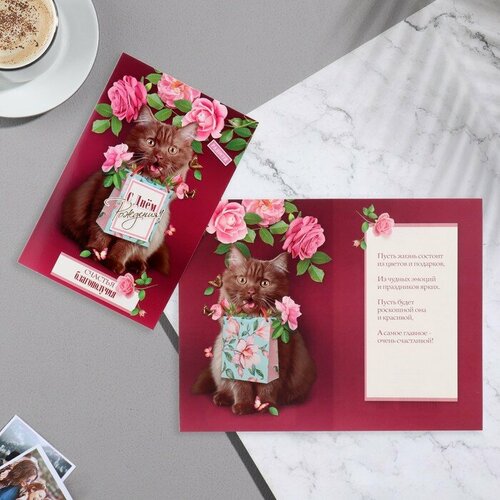 Открытка "С Днём Рождения!" кот, розы, малиновый фон, А5