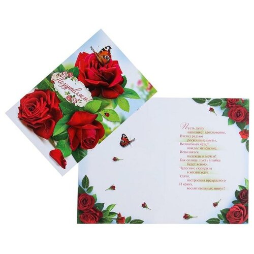 Открытка "Поздравляем!" красные розы, бабочка, глиттер, А4