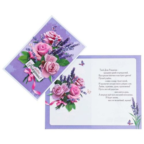Открытка "С Днем Рождения!" розы, сиреневый фон