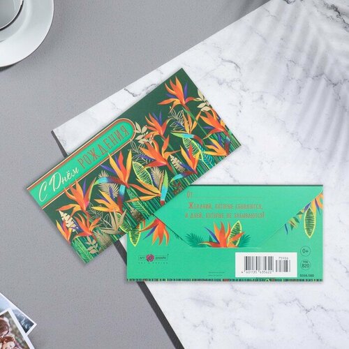 Конверт для денег "В чудесный День Рождения!" вырубка, тиснение, черный фон, цветы, 8,3х16,7 см 9505