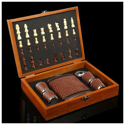 Набор 7 в 1: фляжка 8 oz, чешуя, 4 рюмки, воронка, шахматы, 18 х 24 см