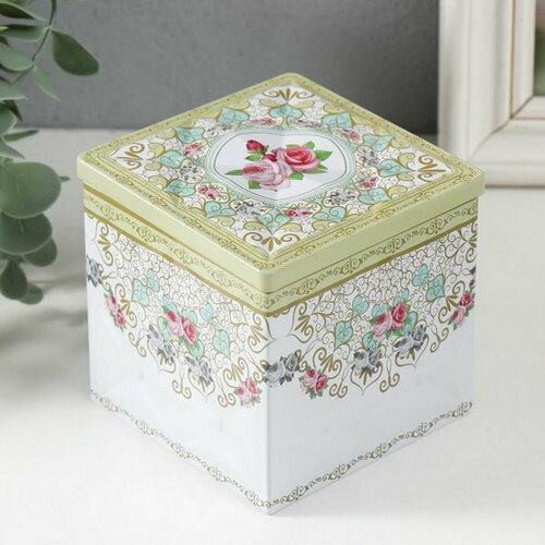 Шкатулка металл квадрат "Розы и орнаменты" грани 9х9х9 см