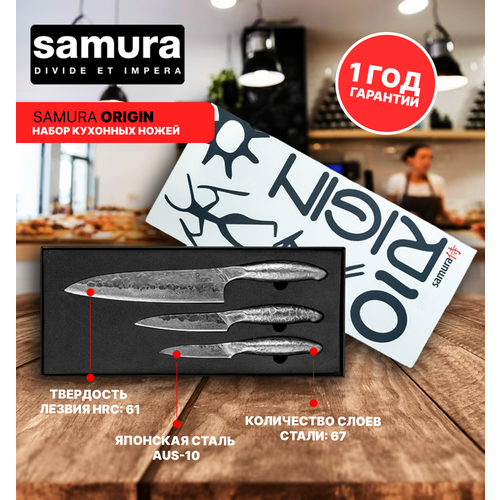 Набор из 3 кухонных ножей "Samura ORIGIN" (10, 21, 85), AUS-10 дамаск 67 слоев