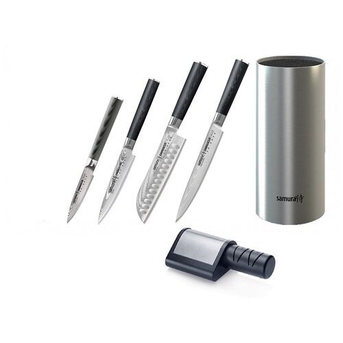 Набор из 4-х ножей SAMURA DAMASCUS, овощной, универсальный, сантоку, слайсер, подставка из металла И дисковая электрическая точилка SD-0244МЕТПЭТ