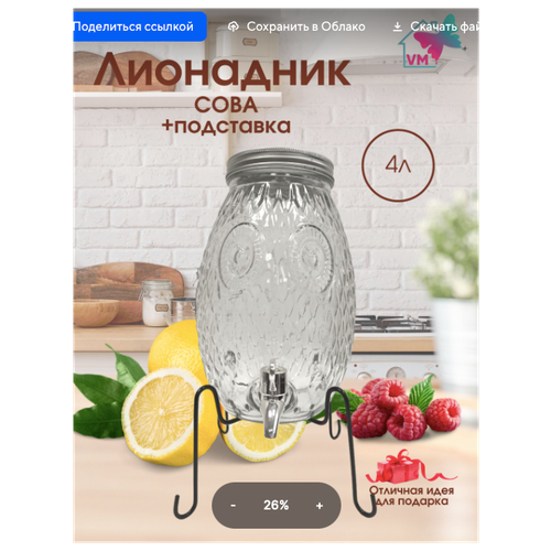 Лимонадник 4 литра "Сова "на подставке стекло белый