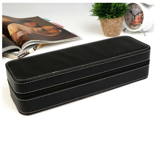 Шкатулка кожзам под часы 6 отделений "Чёрная с белой строчкой" на молнии 7,5х11х33 см