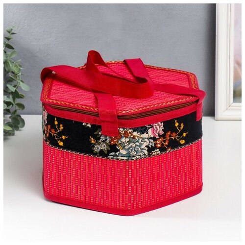 Шкатулка "Цветы на чёрном" красная, с ручками, молния 16х24х28 см