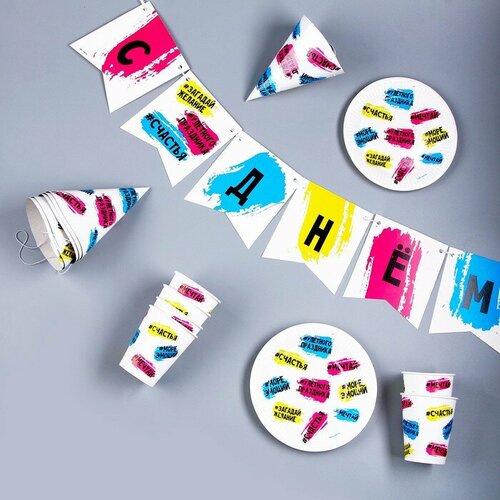 Набор бумажной посуды «С днём рождения»: 6 тарелок, 1 гирлянда, 6 стаканов, 6 колпаков
