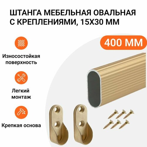 Штанга-вешалка для одежды мебельная овальная с креплениями 30X15 мм золотая L-400 мм