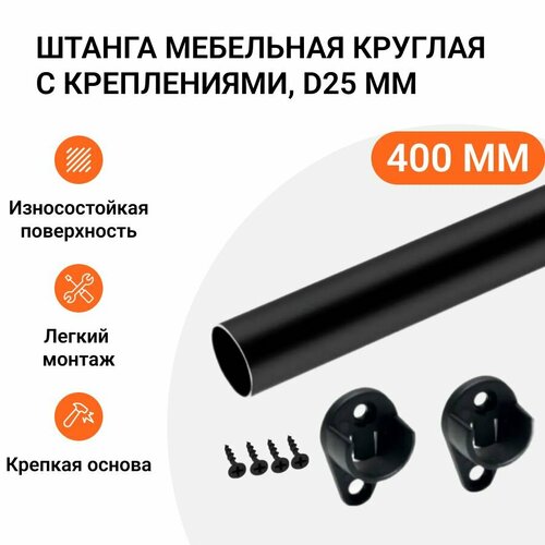 Штанга мебельная круглая с креплениями, D25 мм, черная, L-400 мм