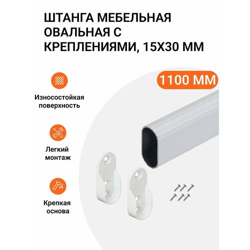 Штанга-вешалка для одежды, мебельная, овальная, с креплениями, 30X15 мм, хром, L-1000 мм серебристый, серый, хром