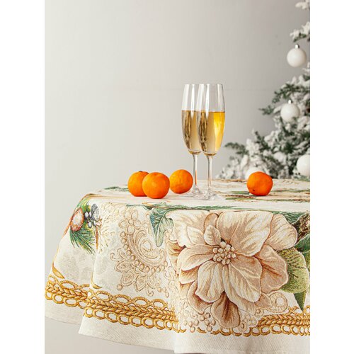 Скатерть Le Gobelin Золотые шары и свеча круглая диаметр 140 см