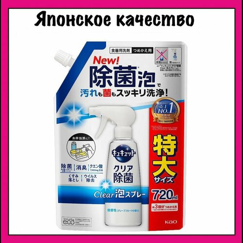 Kao CuCute Clear Японское средство для мытья посуды с лимонной кислотой, аромат грейпфрута, пена-спрей для мытья без губки, 720 мл.