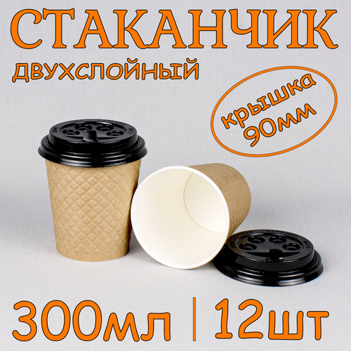 Стакан бумажный двухслойный крафтовый 300 мл с крышкой, 12 шт