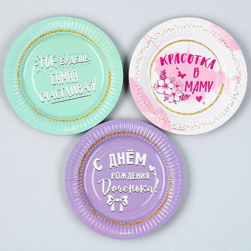 Тарелка бумажная "С днём рождения, доченька", 18 см, в наборе 6 шт.
