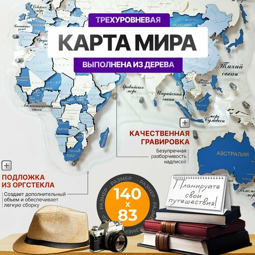 Карта мира настенная из дерева на оргстекле 140х83 см синий голубой