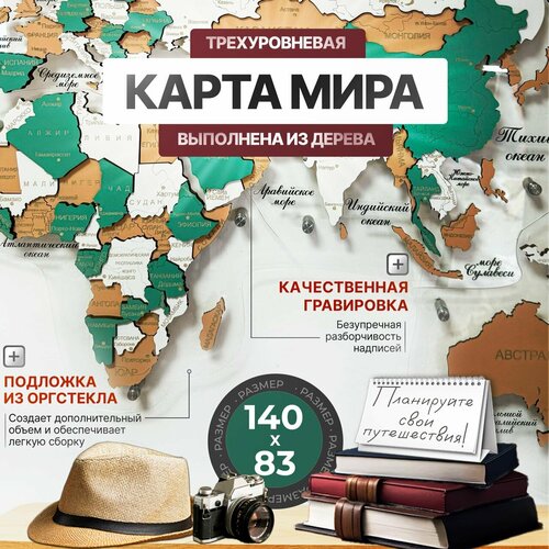 Карта мира настенная из дерева на оргстекле 140х83 см