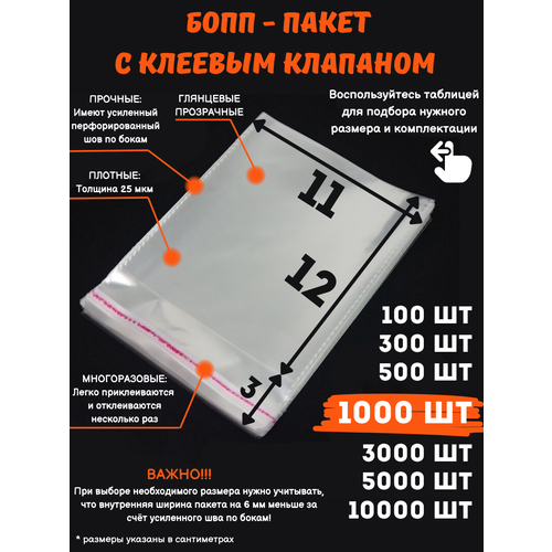 Фасовочные упаковочные пакеты с клеевым клапаном, бопп пакеты с клеевым краем, клейкой лентой 11х12/3_1000 шт