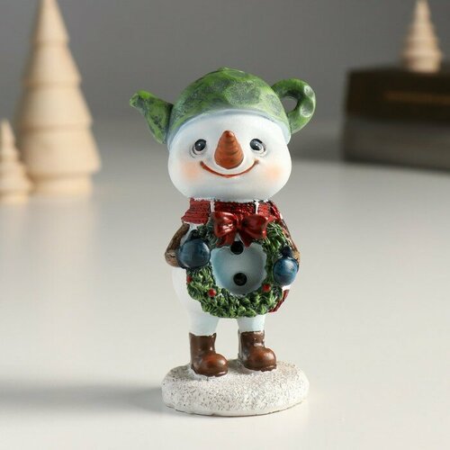 Сувенир полистоун Снеговичок с чайником на голове, держит венок 6х6х11,5 см