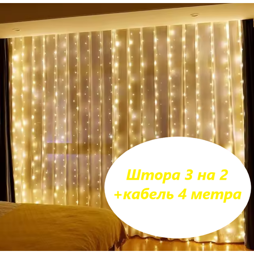 Гирлянда электрическая интерьерная 3х2 метра+кабель 4 метра Новый Год 2023 /320 LED/Светодиодная штора- занавес/Световой дождь/Тюль