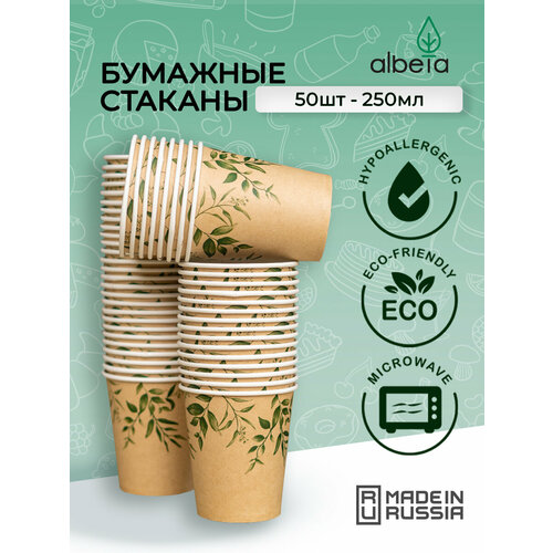 Стаканы одноразовые бумажные для кофе 250 мл набор 50 шт, принт "Листья"