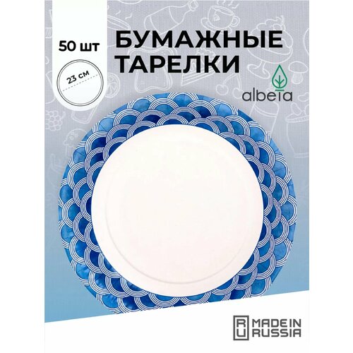 Одноразовая посуда, тарелки одноразовые бумажные белые 23 см 50 штук, принт "Волна"