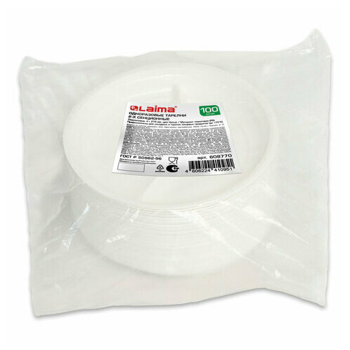 Одноразовые тарелки 2-х секционные комплект 100 шт. 210 мм, белые, ПС, холодное/горячее, LAIMA бюджет, 608770
