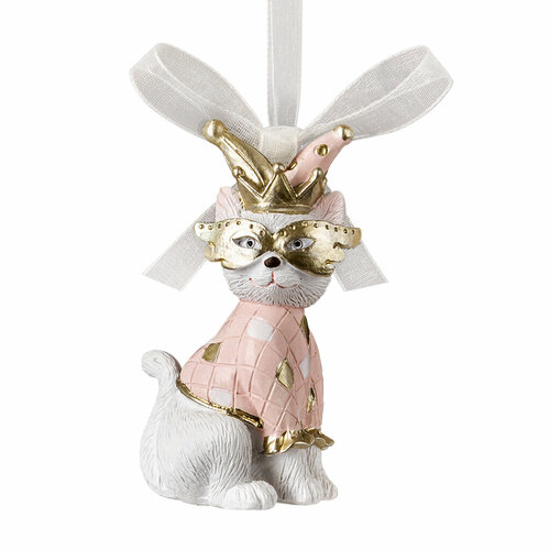 Милый котик одет в свитер с геометрическим узором, подчеркнутым золотой и серебряной краской. На голове красуется шутовской колпак и корона. Карнавальная маска делает образ оригинальным. Украшение отличается тонко выполненными деталями. Изделие оснащено шелковистой ленточкой для подвешивания. Данная серия игрушек разработана для елок высотой до 1.5м. Групповая упаковка предназначена только для безопасной транспортировки и хранения.