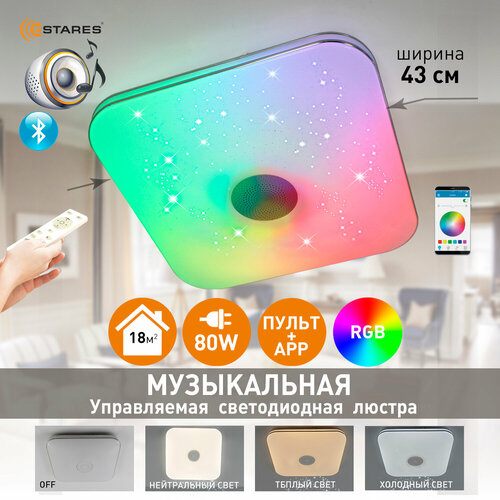 Управляемая светодиодная музыкальная люстра a-play RGB 80вт квадрат (муз. колонка + пульт)