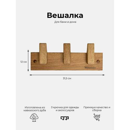 Вешалка деревянная настенная "Woodson" с тремя крючками из дуба в стиле лофт для бани и дома