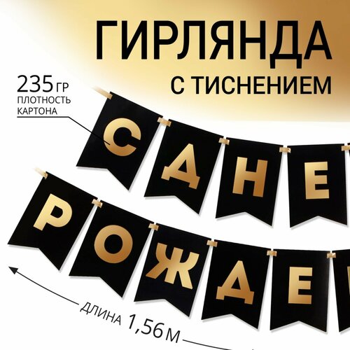 Гирлянда тиснение на бумаге «С Днем Рождения», черная, золотые буквы, дл. 156 см, 250 гр/кв. м