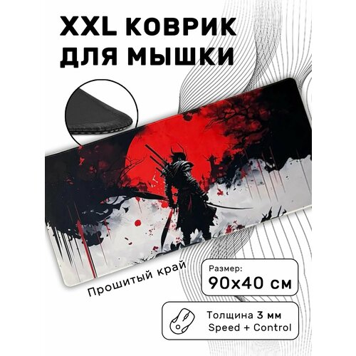Коврик для мышки большой, игровой коврик в японском стиле для мышки и клавиатуры 90х40 см, самурай с катаной на фоне красной луны