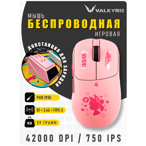 Мышка беспроводная для компьютера игровая Valkyrie M2 PRO / PAW 3950, 42000 DPI, 59гр / C док станцией. Розовая