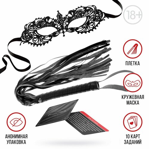 Плётка и маска в наборе для двоих «50 оттенков страсти», 3 в 1 (10 карт, маска, плётка (цвет микс)), 18+